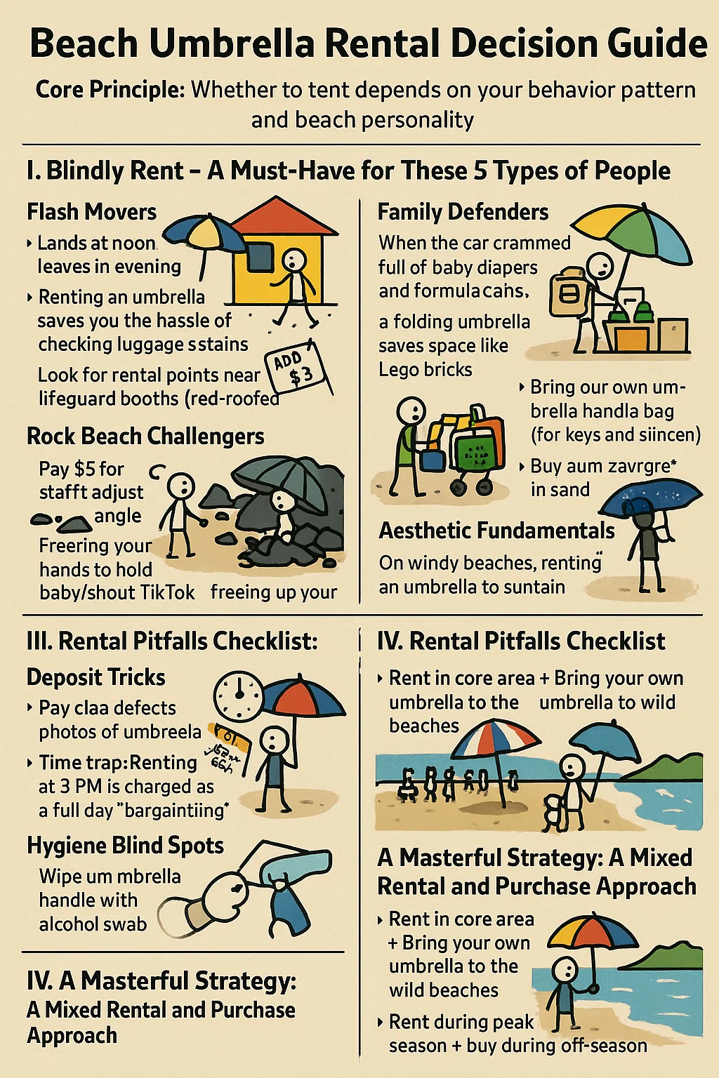 Izazivači na Rock Beachu: Ne možete smjestiti vlastiti suncobran na vulkansku stjenovitu plažu → Iznajmljivanje kišobrana izrađenog po narudžbi pričvršćenog ekspanzijskim zavrtnjima: Za one koji su izrazito lijeni: platite 5 dolara za osoblje da namjesti kut i pričvrsti kišobran, oslobađajući vaše ruke za držanje bebe/snimanje TikTok videa. Za avanturističke korisnike: unajmite kišobran sa bočnom zavjesom kao privremenu prostoriju za presvlačenje ili unajmite fluorescentni kišobran za noćno cyberpunk fotografiranje na plaži.