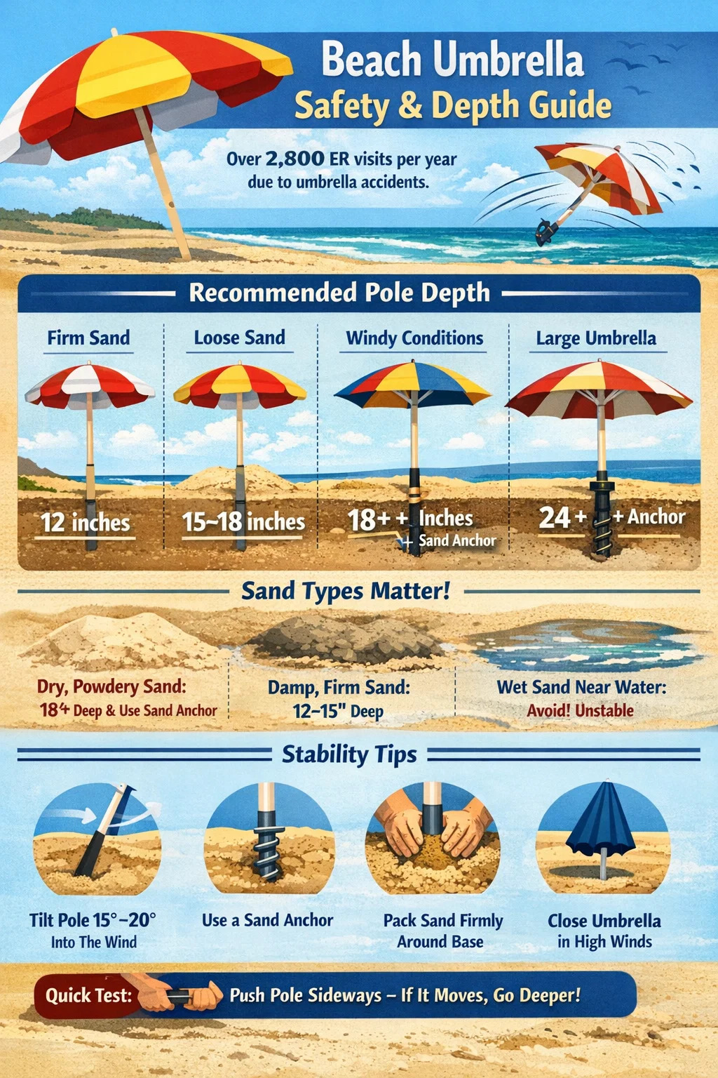 Općenito preporučeni minimum od 12 inča primjenjuje se u prosječnim uvjetima na plaži: umjereno zbijeni pijesak, lagani do blagi povjetarac (ispod 10 mph) i standardni suncobran za plažu od 6–7,5 stopa. U stvarnim uvjetima često ćete morati ići dublje.
