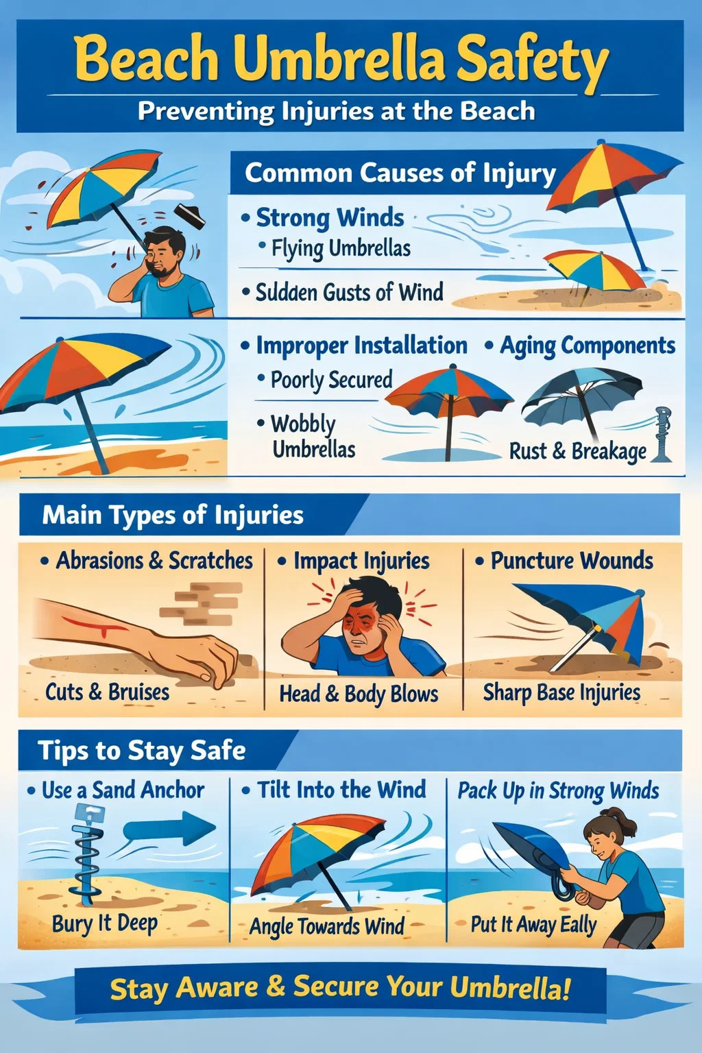 Iako je odlazak na plažu namijenjen opuštanju, suncobrani za plažu , ako nije pravilno osiguran, doista može postati potencijalna sigurnosna opasnost. Svake godine mnogo ljudi se ozlijedi dok uživaju na suncu.