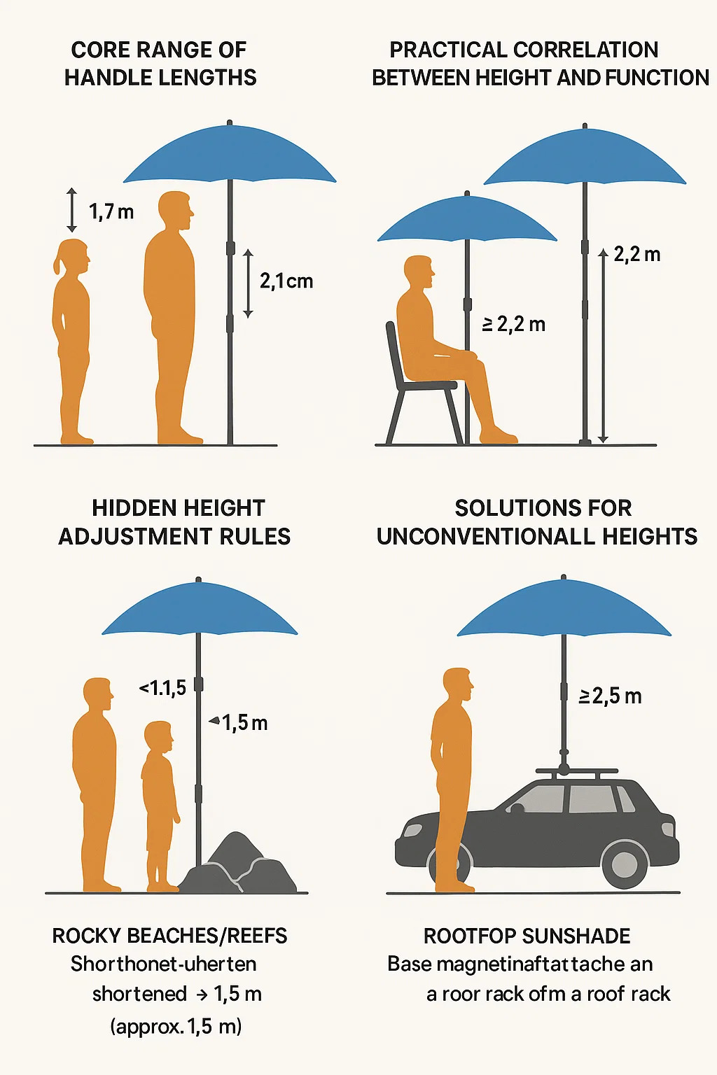 Kratki kišobrani (≤1,8 metara): dizajnirani za zaštitu od sunca dok sjedite. Visina ruba odgovara naslonu stolice za plažu (70-80 cm), osiguravajući da je glava izložena suncu dok stoji.