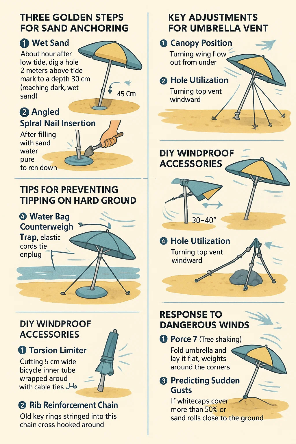 Položaj nadstrešnice: Kad se vjetar podigne, odmah nagnite kišobran 30-40 ° kako bi se vjetar omogućio da izlazi ispod kišobrana, a ne gore u njega (s rebrama paralelnim s smjerom vjetra).