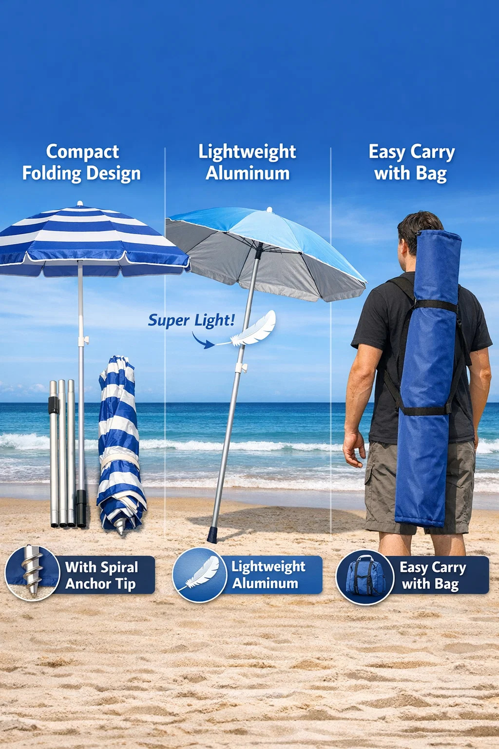 Kako biste uštedjeli prostor, najbolje je kupiti suncobran za plažu sa "spiralnom bušilicom" glavom na dnu stupa, tako da ne morate nositi dodatnu glomaznu plastičnu podlogu ili zasebno sidro za pijesak.