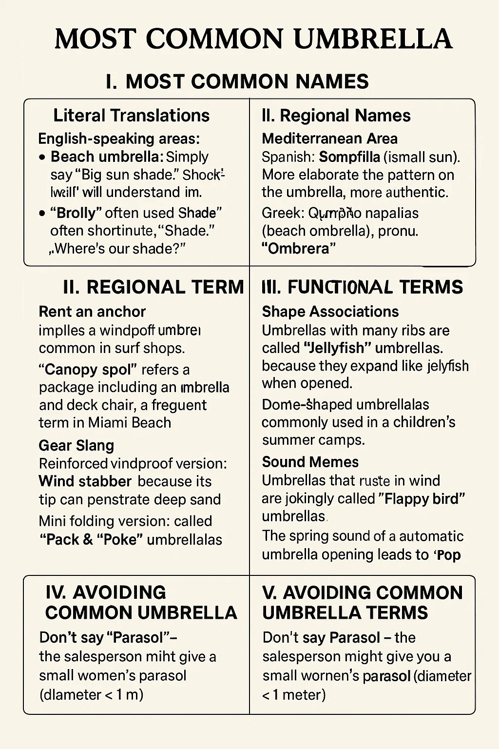Ovdje su uobičajeni nazivi za suncobrani za plažu u različitim kontekstima: