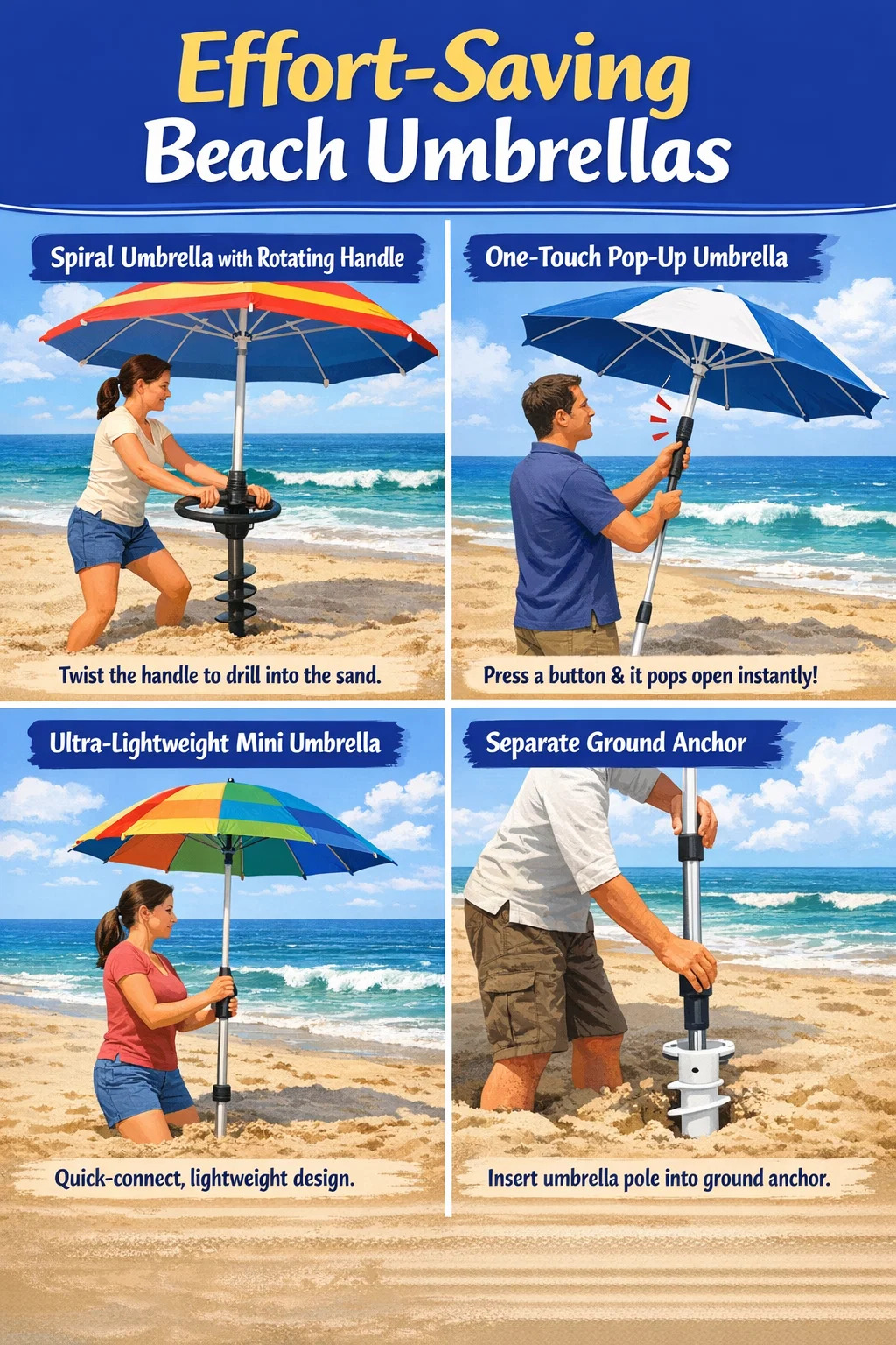Prednost uštede napora: Koristeći princip poluge, čak i žene ili starije osobe s manje snage mogu lako zakopati kišobran duboko u pijesak.