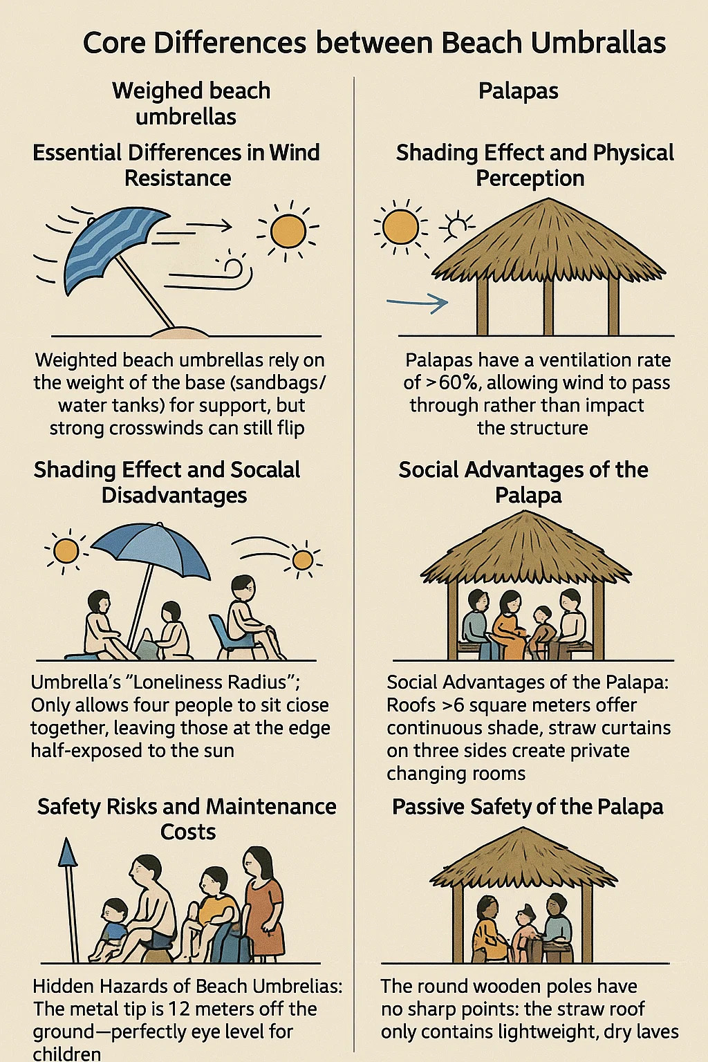 Ograničenja zaštite od sunca na plaži: sjena ispod kišobrana pomiče se s kutom sunca, zahtijevajući česta podešavanja. Srebrni premaz odražava toplotno zračenje iz zemlje neučinkovito, pa čak i u podne, kada je površina pijeska 60 ° C, temperatura ispod kišobrana još uvijek može prelaziti 40 ° C. Palape nude prirodno hlađenje: zadebljani palmini frondovi apsorbiraju toplinu, a ne odražavaju je, održavajući konstantnu razinu vlage (mjereno na plaži, 3-5 ° C niže nego ispod kišobrana); Potpuno sunčanje ne zahtijeva prilagodbu.