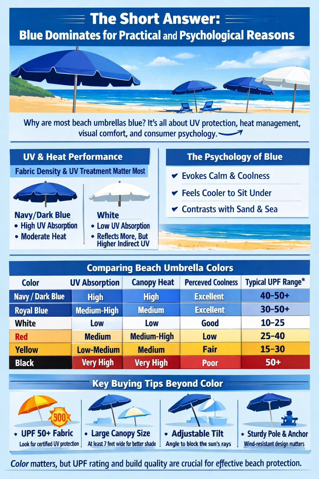 Psihologija boja igra značajnu ulogu u dizajnu proizvoda, a tržište suncobrana nije iznimka. Istraživanja potrošača proizvoda za slobodno vrijeme na otvorenom dosljedno pokazuju to plava izaziva hladnoću, smirenost i opuštanje — asocijacije koje su izravno povezane s onim što netko želi osjećati dok sjedi na vrućoj plaži.